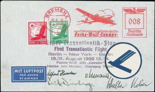 1938 (Aug 10) Focke Wulf 200 "Condor" record breaking flight from Berlin to New York and back, flown cover with 5pf + 10pf cancelled by red 8pf Focke Wulf Condor meter mark, with flight cachet, signed by the four crew, Alfred Henke, R. von Moreau, Paul Dierberg and W. Kober. The flight to New York completed in 24hr 56min., the return flight in 19hr 56min. Fine and rare, very few covers carried. Photo on Page 46. (Image1)