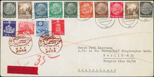1938 (Nov 27) Focke Wulf 200 "Condor" record breaking flight from Berlin to Tokyo, completed in 46hr 18min, express cover to Paul Dierberg at the Focke Wulf factory in Berlin, ten German stamps totalling 54pf cancelled at Bremen with four Japan stamps tied by the special pictorial cancel on Nov. 30th. Also a Japanese card with map of the route and 2s cancelled to order with the Japanese datestamp. Vertical fold, otherwise fine and rare, very few covers carried, the same aircraft and crew used as for the August flight to and from the USA. (2). Photo on Page 46. (Image1)