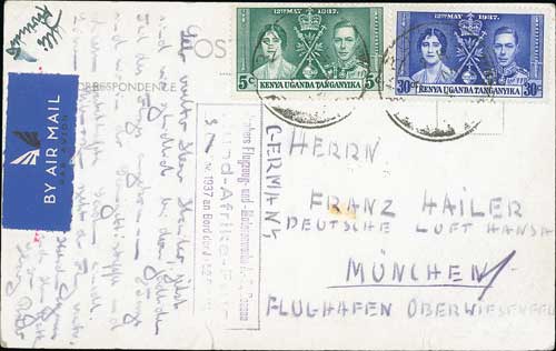 1937 (Nov 3) Picture postcard to Germany bearing KUT 5c + 30c cancelled at Arusha, boxed cachet "Junkers Flugzeug-und-Motorenwerke A.-G., Dessau / Rund-Afrika-Flug / 3 Nov. 1937 an Bord der Ju 52 D-AMUO". Very scarce, just one other postcard from KUT recorded by Colley. Photo on Page 48. (Image1)