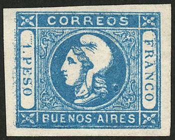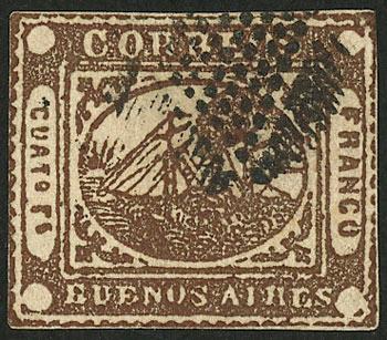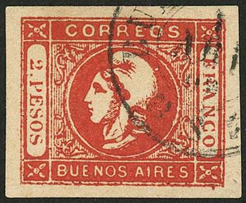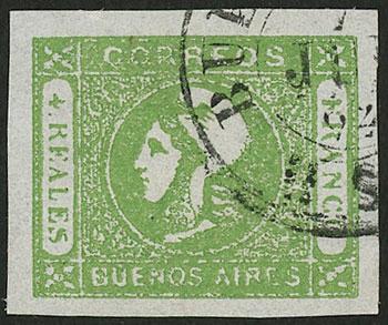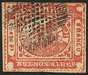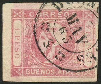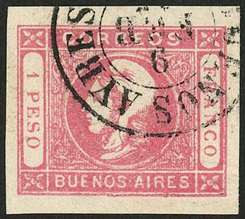 GJ.21, 1P. dull rose, worn impression, very ample margins, used in B.Aires on 7/MAY/1863, superb example! (Image)