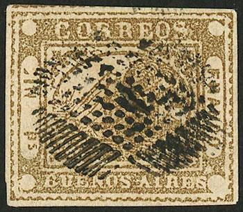 GJ.10, IN Ps. yellowish dun, with complete 8x8 ponchito cancel, immense and incredible margins, so large that they do not seem genuine but they are, possibly the most handsome example in existence (this quality is only seen in 1% of Barquitos, if not less!), superb quality! (Image)