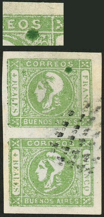 GJ.16, 4R. green, worn impression, very nice vertical pair, the top stamp with VARIETY: large ink spot below the R of CORREOS, mute 7x7 dotted cancel, excellent quality! (Image)