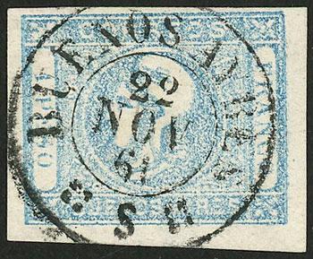 GJ.17A, 1P. milky blue, fantastic example of large margins and very defined color, with spectacuar datestamp applied in Buenos Aires on 22/NO/1861, superb quality! (Image)