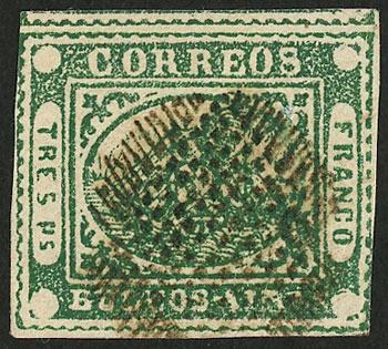GJ.6, TRES Ps. green, fantastic example of large margins (stealing part of neighboring stamp at top), with "ponchito" cancel, very fresh, perfect, outstanding example! (Image)