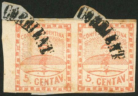GJ.1, 5c. small figures, pair on a small fragment, both stamps with the very rare "CORRIENT" in small arch (+600%), excellent quality, very rare! (Image)