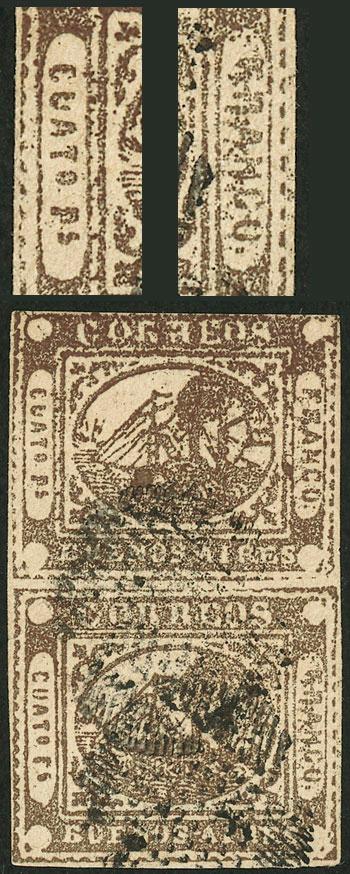 RARE PAIR: GJ.9a + 9, 4Rs. chestnut, vertical pair with 2 varieties: the top stamp with the error "CUATO Ps" (GJ.9a) and the lower stamp with very notable PARTIAL DOUBLE IMPRESSION on the word "FRANCO" (variety not catalogued for this value!), excellent quality, very rare. With signature of Juan Mautalén on back (Image)