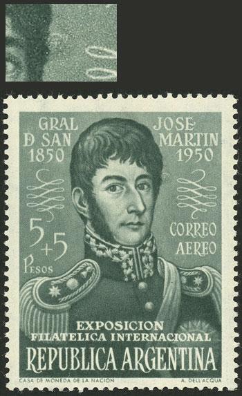 GJ.992a, 1950 San Martín 5+5P., with VARIETY: "Retouch disguised with round shape, at right next to eyebrow" (position 4), it will be included in the next edition of the GJ catalog as GJ.992a, rare, very fine quality! (Image)