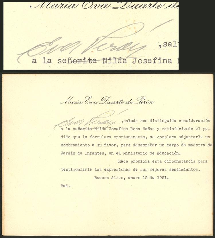 PERÓN, Eva: Letter dated 12/JA/1951, informing a kindergarden teacher about her new appointment as requested. With her hand-written signature, excellent quality, rare document! (Image)