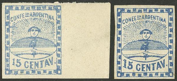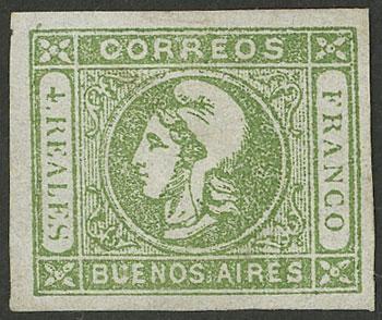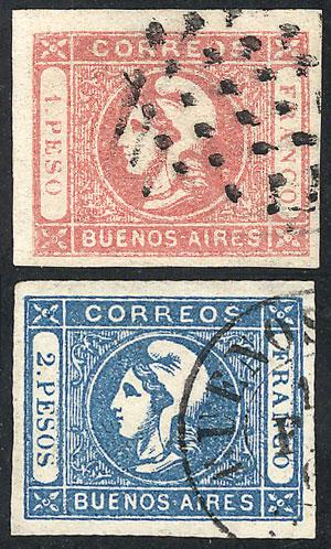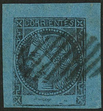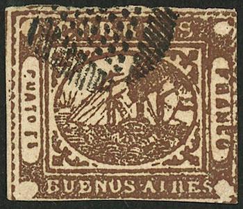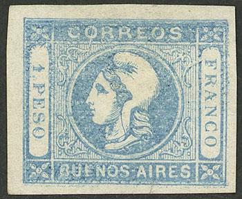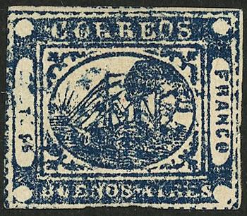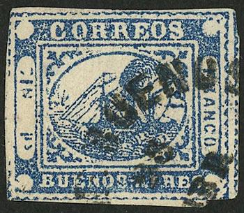 GJ.11, IN Ps. blue, type 36 on Kneitschel´s reconstruction, huge margins (stealing part of frame line of neighboring stamp), datestamp of Buenos Aires, there is a tiny thin on back, insignificant given its beauty and superb front! NOTE: At the buyer's request, we can provide a certificate of authenticity (Image)