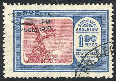 GJ.669a, 1930 1.80P. Zeppelin with GREEN ovpt, with variety: Overprint shifted towards top-left, used, signed by Victor Kneitschel, excellent quality, rare! (Image)