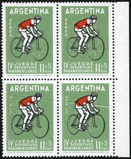 GJ.1258a, 1963 Cycling, block of 4 with varieties: "Jacket very shifted", also "notable paper fold in the bottom right stamp" and "excess green ink (background) in the bottom stamps (the spokes are hardly seen)", VF quality! (Image)