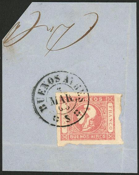 GJ.21, 1P. rose, wide margins, on fragment with datestamp of Buenos Aires, excellent quality! (Image)