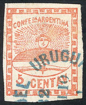 GJ.1, with rimless blue datestamp of CONCEPCIÓN DEL URUGUAY (+200%), superb example, signed by Alberto Solari (Image)