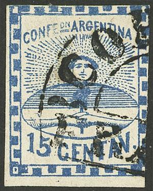 GJ.3A, 15c. dark blue, plate B, with semi-circle "CORDOBA-FRANCA" cancel, extremely rare, with Alberto Solari certificate (Image)
