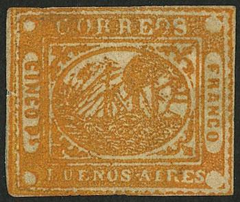 GJ.8, Cinco Ps. ocher-orange, oily impression, handsome stamp of ample margins and very good color, mint, with a heavy horizontal crease and so it has a hinge on back reinforcing it, the front is exceptional, rare (it is one of the most beautiful examples I have seen)! NOTE: At the buyer's request, we can provide a certificate of authenticity (Image)