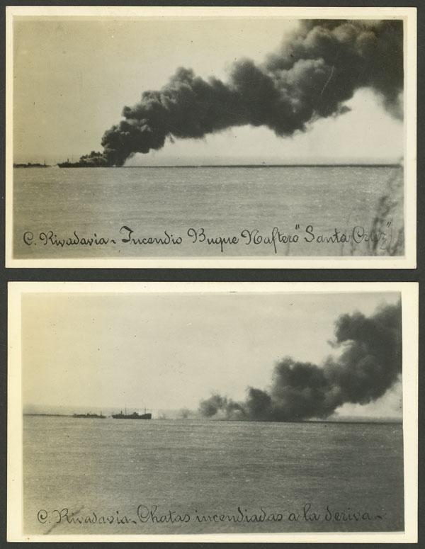 Oil tanker "Santa Cruz" on fire, Comodoro Rivadavia, year 1933: 2 real photo PCs, excellent quality, rare! (Image)