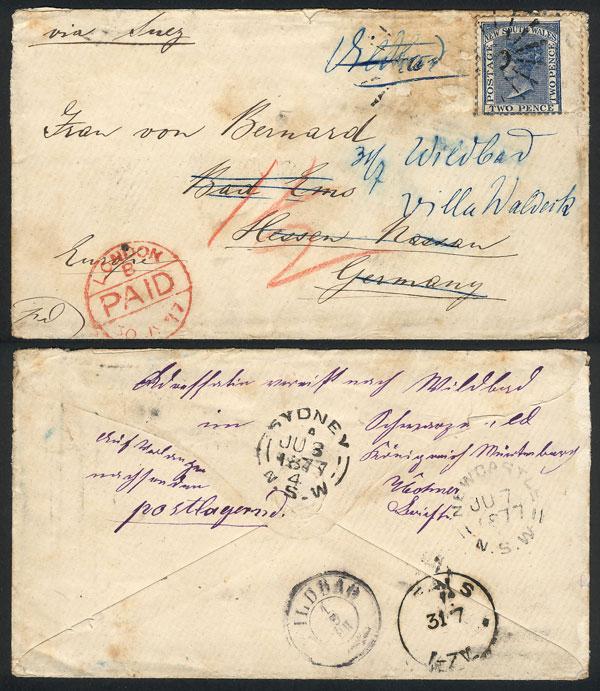 Cover sent from NEWCASTLE to Bad Ems (Germany) on 7/JUN/1877, franked with 2p. with "55" numeral cancel (the original postage had another stamp, lost in transit to Europe). With transit marks of Sydney (8/JUN), London (30/JUL), arriving in EMS on 31/JUL and forwarded to WILBAD (arrival 1/AU), with manuscript inscriptions by postal clerks on front and back, fine quality, very interesting! (Image)