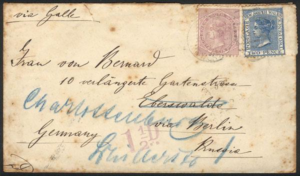 Cover sent from NEWCASTLE to Germany on 19/JA/1880, franked with 2p. blue + 6p. lilac with "55" numeral duplex cancel, due mark of 1½p. for insufficient postage, transit marks of Sydney (20/JA) and London (4/MAR), it arrived in Eberswalde on 6/MAR and was forwarded to Charlottensburg, with arrival on the same day. With some stain spots, all the same very attractive and interesting! (Image)