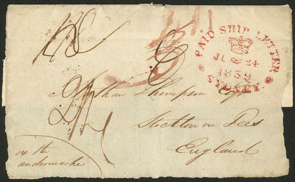 Front and part of the back of a folded cover sent from Sydney to England on 24/JUN/1839, with several marks on front and back, interesting! (Image)