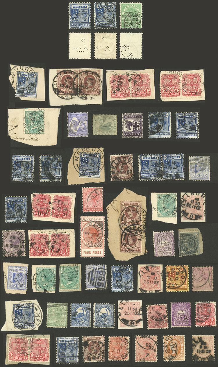 Group of old used stamps (some on fragments), some perfed (perfin or official), very fine general quality, interesting lot! (Image)
