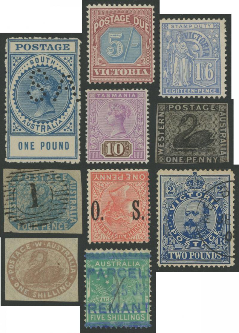 Mostly unused/mint selection on Scott leaves with South Australia 'POSTAGE & REVENUE' six values to £3 overprinted 'SPECIMEN', Thick 'POSTAGE' 5/- & punctured 'SA' £1 (very scarce), Wide Setting 'O. S.' 1d with the Overprint Inverted; Tasmania Tablets to 10/- and 1899-1900 Pictorials; Victoria Laureate 1d, Large Stamp Duty 2/6d orange & 5/- maroon/yellow, 1/6d blue x2, 'POSTAGE' to 5/- x3 (one punctured 'OS' + CTO £1 & £2, Charities (no gum) 1897 'Specimen' duo & 1900 2d, Postage Dues Blue & Maroons set (5/- part-gum) and Red & Greens set CTO; and Western Australia with an almost very fine Penny Black (3½ margins), a superb Litho 4d (used) & very fine 1/-, 4d vermilion x2, 'ONE PENNY' on 2d, V/Crown 5/- x2 (one used with rare boxed 'PARCELS/FREMANTLE' datestamp) & £1 and Crown/A 5/- (used); etc, condition a bit variable but generally fine to very fine. Rather patchy still quite a good lot.