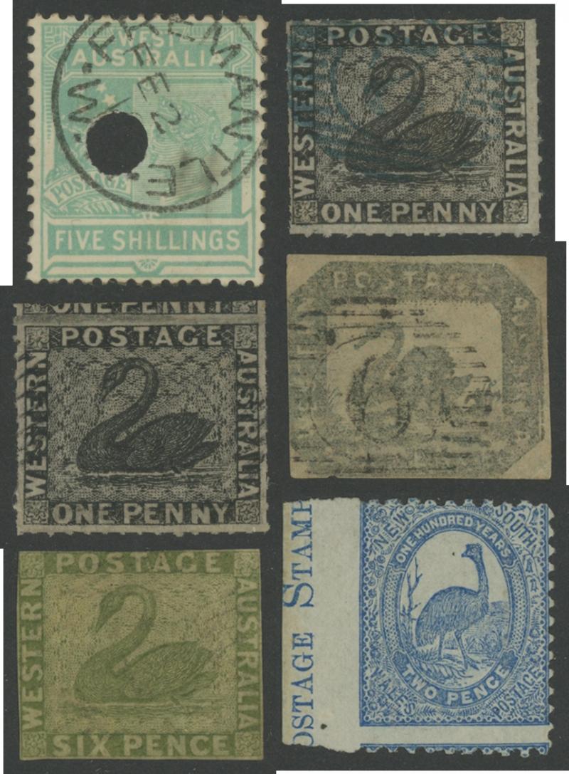 Consignment remainders with some useful Western Australia including two unusually large 'Penny Blacks' both with faked roulettes, Lithos 4d x2 & 1/- all with margins in places, Hillman Lithos 2d (clipped corner) & 6d (repaired corner), 1860-64 4d apparently used but probably a fake cancel & 1/- (very lightly cancelled), 1861 Intermediate Perf 1/- & 6d faked to appear as if it is on blued paper, several mint to 2/-, nine values to 5/- CTO with concentric-circles, a few commercial perfins, 2/- 2/6d & 5/- each with telegraph punctures & 2d with 'Medical' Handstamp; Numeral Cancels unsorted array on Hagners including a page of WA, some very fine strikes & potential for 'finds'; a page of SA pickings including multiples & very fine 'GUMBOWIE' squared-circle (rated RR); and oddments from all Colonies/States; condition variable.