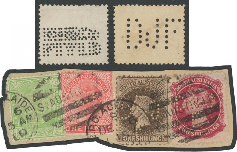 Official & commercial perfins array on clear pages with all Colonies/States represented including strong sections of NSW, South Australia to 2/- & Victoria plus Tasmania to 6d x6, two pages of Kangaroo 3d punctured 'OS' & some KGV, bound to be many scarce patterns & we noted a few perfin errors, some better Commonwealth stamps including Engraved 6d, Robes 5/- x19, 1953 Tasmania 2/- pair, condition variable but many are fine to very fine.