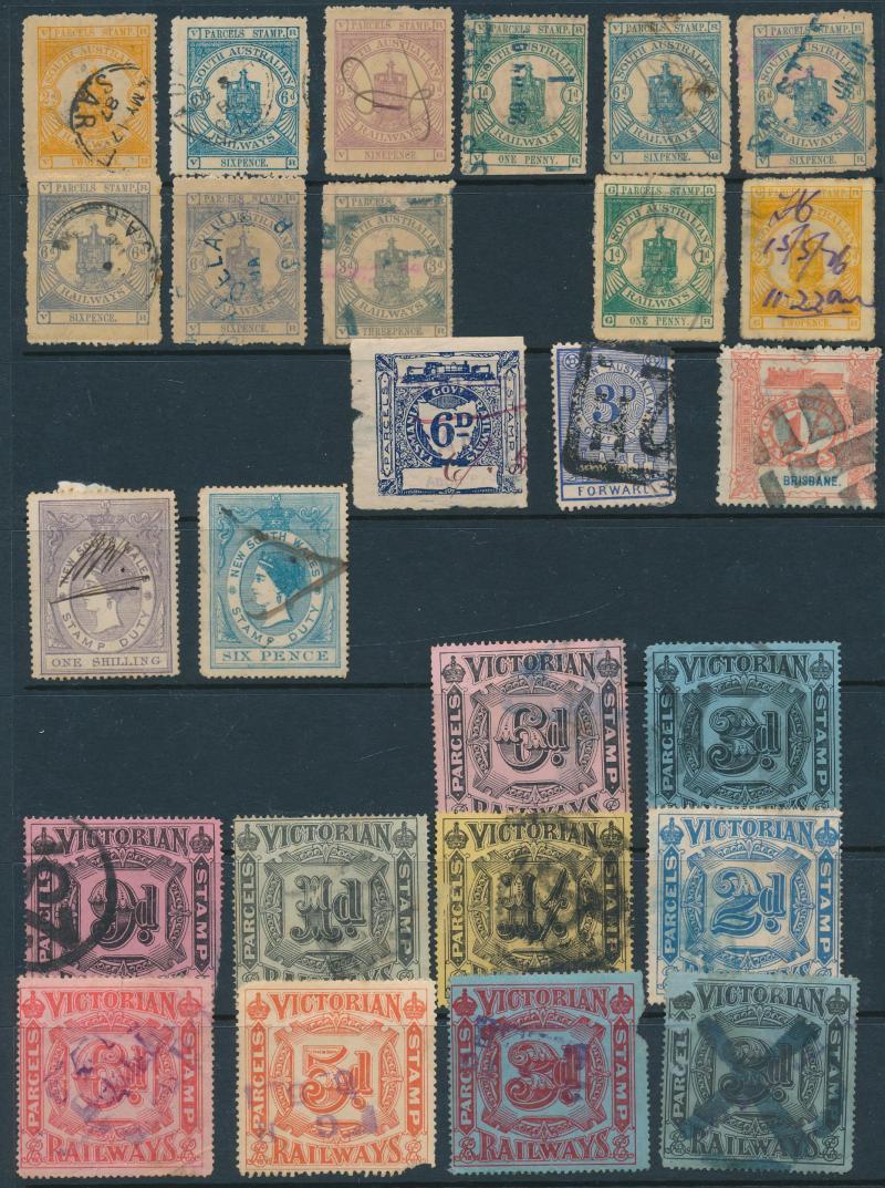 Odd lot with early Railway Stamps including NSW 3/-, Queensland 5/-, SA 'VR' to 9d and 'GR' 1d & 2d and Victoria Large Format 1d x4, also range of Revenues with pickings & three pages of Recorded Music Royalties stamps including unusual denominations & surcharges, condition variable.