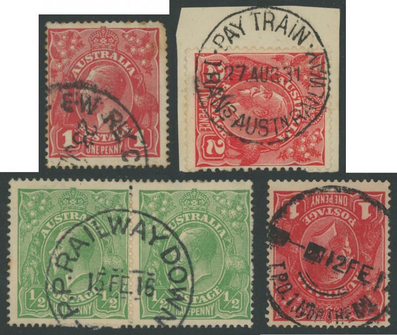 TRAVELLING POST OFFICES: Commonwealth Period mostly on KGV Heads plus a few Kangaroos, principally from Queensland, South Australia & Tasmania with several rare markings noted, Tasmania including 'TPO WESTERN LINE/TAS', WA with superb 'GOLDFIELDS/TPO' on Swan 2d yellow, some duplication, and a few covers in mixed condition.