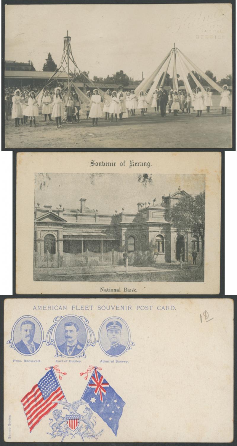 Original oldtime family collection with a quality group from Victoria including a 1908 court-size but divided back card "...Kerang/National Bank', 1908 Maypole Dancing (at Bendigo?), several real photo types with women playing croquet, c.1910 Empire Day at Beringa School & 'Frankston Rd, Chelsea...', a couple of better 1908 Visit of the US Fleet cards; useful oddments from other States & some Australiana; also Britain including small villages & a nice range from Cornwall, Scotland with Perth group including 1911 Coronation Procession, 1916 Irish Rebellion x2 etc; condition variable but most are fine to very fine.