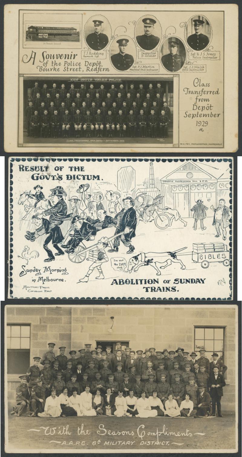 Small box with many better cards including a lovely batch of mostly Talma theatre types including some we haven't seen before, lots of Australiana including police, military, patriotic, children, humour & advertising etc, condition variable but most are fine to very fine.
