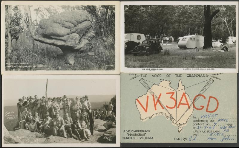 VICTORIA: The Grampians (Gariwerd) intriguing 1950s group of mostly real photo cards taken by tourists including of their companions scrambling all over the unusual rock formations, plus Rose photo-mechanical cards highlighting the dramatic landscape, and of tourist facilities, Halls Gap, Lake Wartook etc, and a Halls Gap ham radio card, generally very fine.