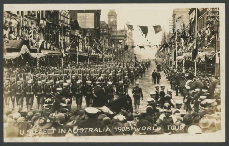 1908 VISIT OF THE AMERICAN FLEET: Mounted group including Victoria 'Garden State' set of 12 & 1½d Postal Card, various Welcome types, Fleet entering Sydney Harbour x2, a couple of real photo types, advertising including 'Princes Bridge Glaciarium' trade card, etc, includes a few we haven't seen before, condition variable. Also the attractive 12pp Official Programme for the Visit to Auckland.(creased).
