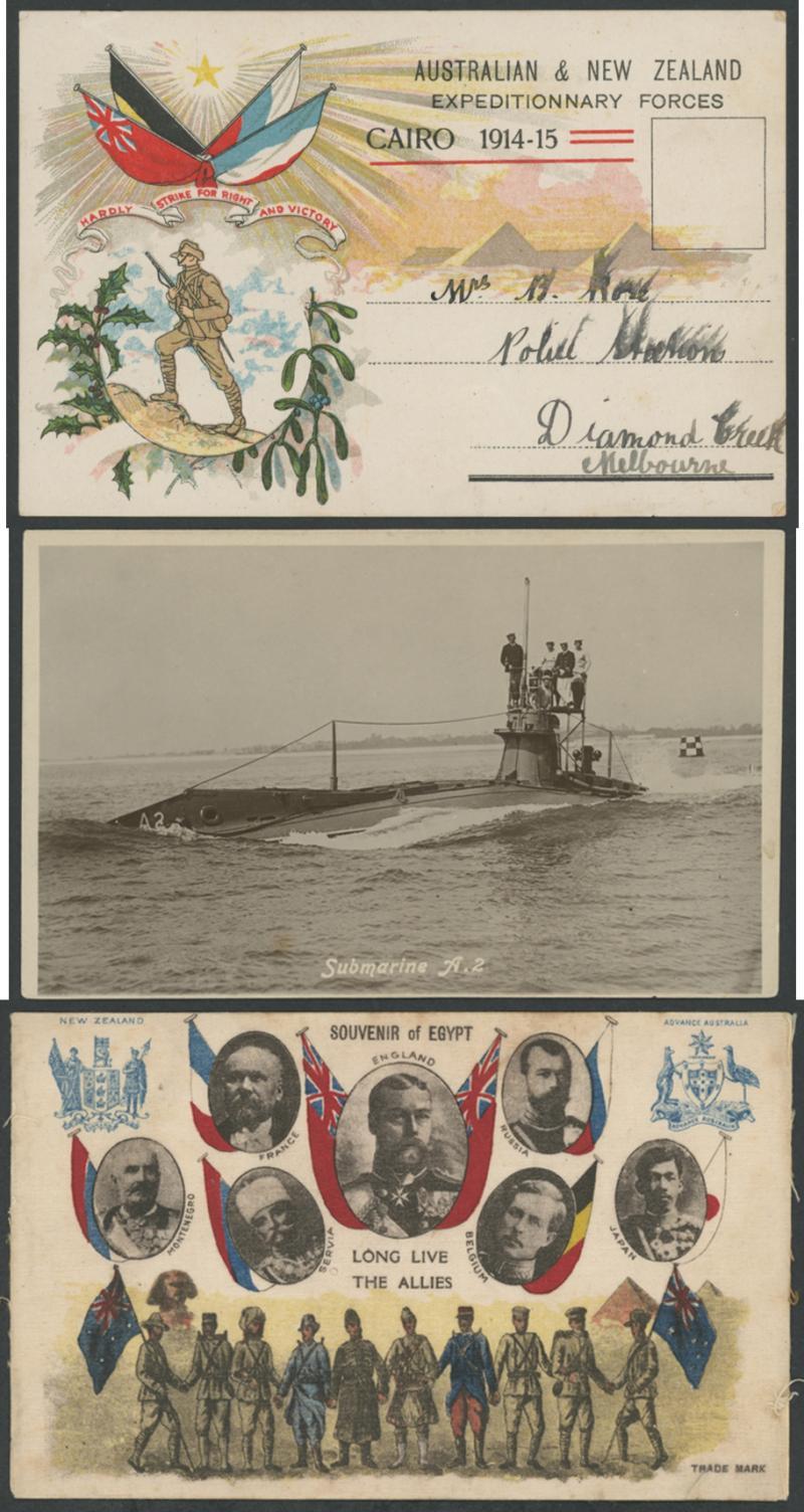 MILITARY: Annotated batch of mostly WWI cards a few real photo types of Victorian Camps including a marvellous shot of 200 or so horses IN Lake Burrumbeet !, Gallipoli, Submarine 'A2' with Officers on the conning tower, Middle East, naval ships, patriotic "silks" including a beautiful 'LONG LIVE/THE ALLIES' with Aussie Coat of Arms & Flag, Western Front, Victory etc, also some ephemera and postal history including 1916 large parcel piece with complete ANZAC addressing label, condition variable but many are fine to very fine. Ex Ron Lee.
