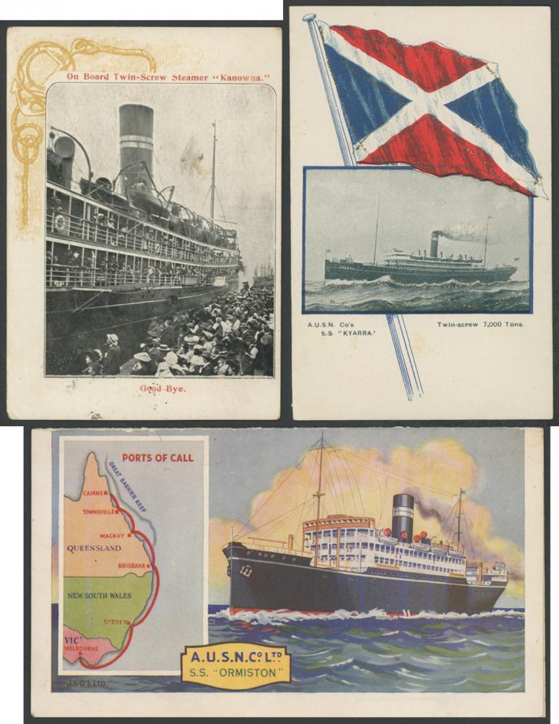 SHIPPING - AUSTRALIAN UNITED STEAMSHIP CO: Partly-annotated pre-WWII collection of mostly ship 'portraits' including unusual angles & interiors, many real photo & photo-mechanical types & beautiful artist cards including a menu letter card, condition variable but generally fine to very fine.