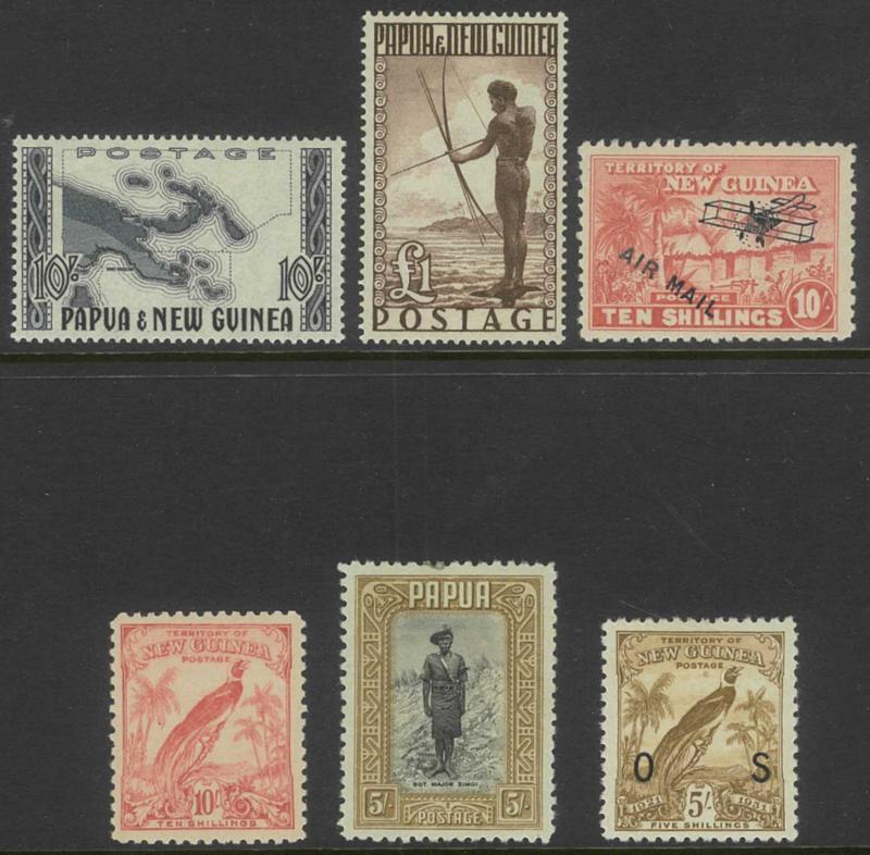 Selection on Scott leaves with New Guinea including Hut Airs to 10/- (no 5/-), Undated Birds to 10/-, Bulolo Airs to 2/- plus 5/- & £1 with thins, Dated Birds 'OS' set, etc; Papua including Large 'PAPUA' set to 2/6d, 1932 Pictorials to 5/-; basic AAT Christmas & Cocos Islands and PNG.