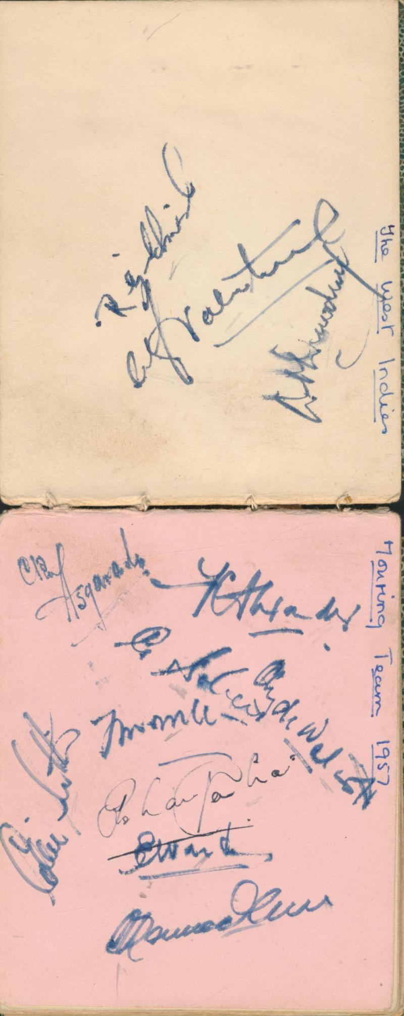 Autograph Books x5 spanning 1950s-90s with 200+ signatures, noted cricket 1957 West Indies team (12) with Gary Sobers; 1956 Surrey team (12) with Peter May, Alec Bedser & Eric Bedser; actors including Sean Connery & Hugo Weaving; tennis players including Mark Woodforde, Monica Seles, Rod Laver & Neale Fraser. (Image1)