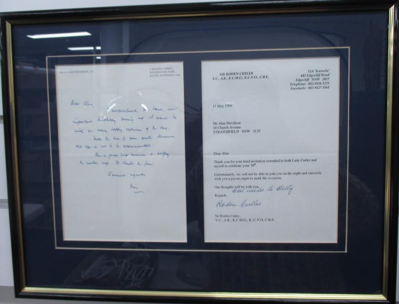 DON BRADMAN & SIR RODEN CUTLER VC signed letters wishing Alan Davidson a happy 70th birthday, window mounted together, framed & glazed, overall 42x32cm. Ex Alan Davidson collection. (Image1)