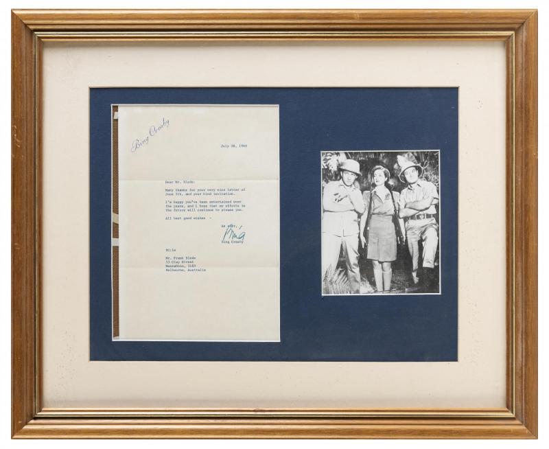 BING CROSBY "Bing" on 1969 letter on 'Bing Crosby' letterhead, window mounted with picture, framed & glazed, overall 55x45cm, mainly Fine. (Image1)