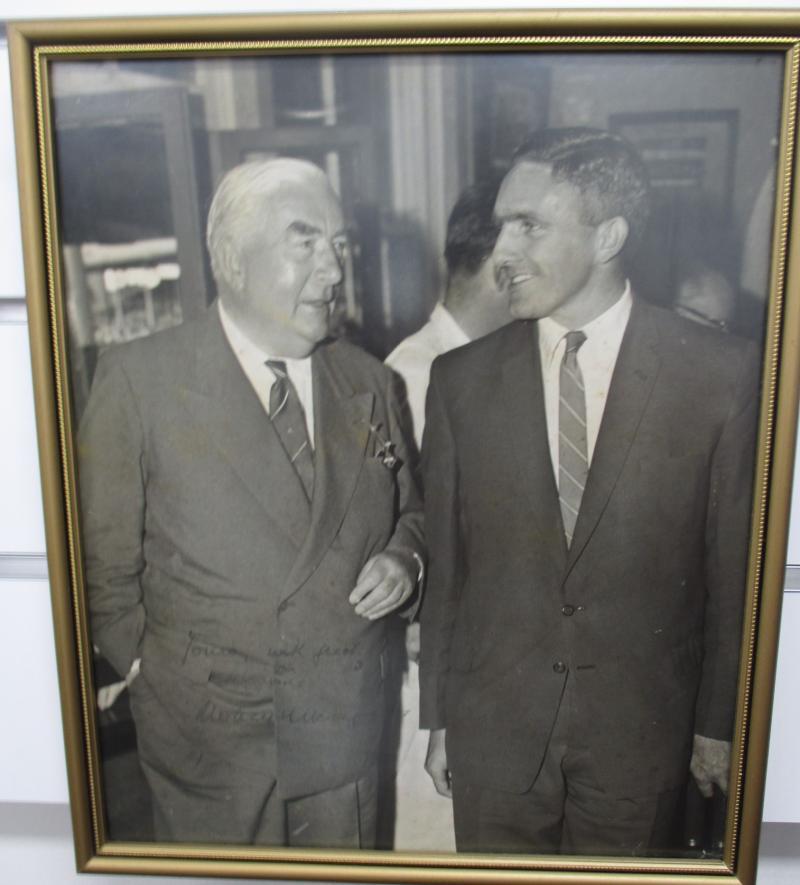 SIR ROBERT MENZIES (1894-1977, 12th Prime Minister of Australia), photograph with Alan Davidson, signed & endorsed at lower right (a trifle faded), framed & glazed, overall 27x32cm. Ex Alan Davidson collection. (Image1)
