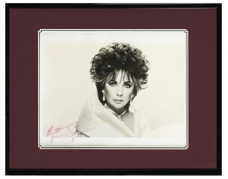 ELIZABETH TAYLOR photograph signed lower left in magenta texta, window mounted, framed & glazed, overall 37x29cm. (Image1)