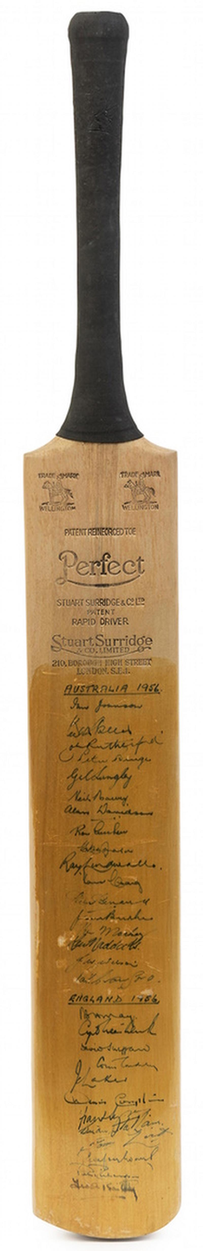 1956-61 Teams 'Stuart Surridge' cricket bat, with "Alan Davidson" in ownership position, signed on front by 1956 Australia & England teams (varnished over the signatures); and signed on reverse by 1958-59 England & Australia teams; plus 1960-61 Australia & West Indies teams, a total of 89 signatures including Ian Johnson, Richie Benaud, Alan Davidson, Peter May, Colin Cowdrey, Denis Compton, Frank Worrell, Gary Sobers & Wes Hall, bat with minor spots, though signatures Fine. Ex Alan Davidson collection. (Image1)
