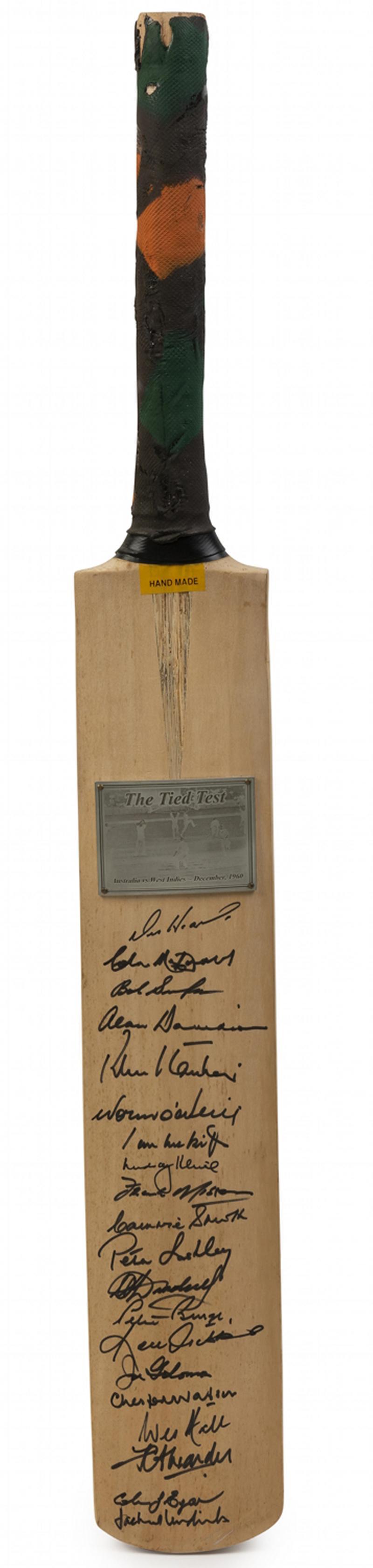 1960 Australia v West Indies "Tied Test" Full size cricket bat, created to commemorate 40th Anniversary of "Tied Test" Australia v West Indies in Brisbane, signed by surviving members, with 20 signatures including Neil Harvey, Colin McDonald, Bob Simpson, Alan Davidson, Rohan Kanhai, Norm O'Neill, Lindsay Kline, Frank Misson, Cammie Smith, Peter Lashley, Peter Burge, Joe Solomon, Chester Watson, Wes Hall, Sonny Ramadhin & umpire Colin Egar, minor tone spots, handle rubber perishing. 28/50 Manufacturer's Release (with 5 extra signatures to public release). With CoA. Ex Alan Davidson collection. (Image1)