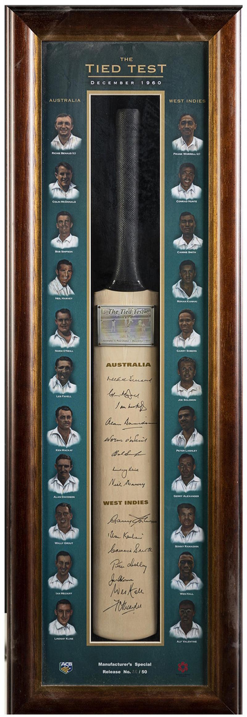 1960 Australia v West Indies "Tied Test" Full size cricket bat, created to commemorate 40th Anniversary of "Tied Test" Australia v West Indies in Brisbane, signed by surviving members, with 15 signatures including Richie Benaud, Ian Meckiff, Alan Davidson, Gary Sobers, Rohan Kanhai & Wes Hall, in attractive display case with mount showing 22 portraits, overall 36x112cm. 28/50 Manufacturer's Release. Ex Alan Davidson collection. (Image1)