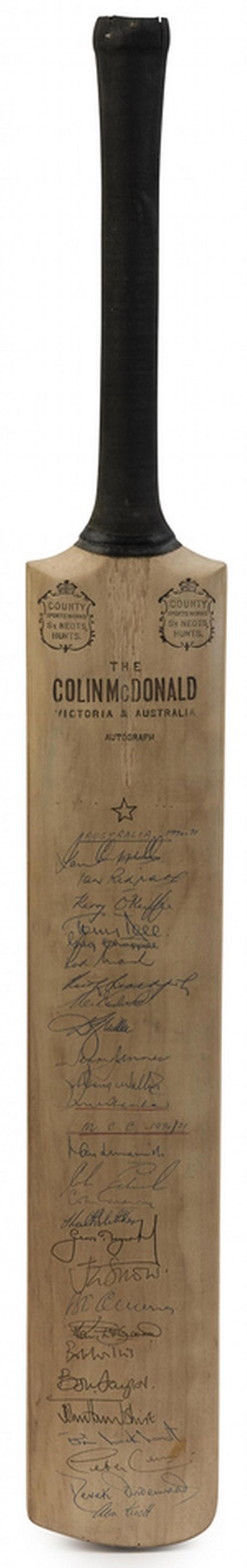 1961-75 'County - Colin McDonald' cricket bat, signed on front & reverse by 1961 England, 1961 Australia, 1970-71 Australia, 1970-71 England & 1974-75 England, with 76 signatures including Colin Cowdrey, Richie Benaud, Ian Chappell, Ray Illingworth & Mike Denness, Fine condition. Ex Alan Davidson collection. (Image1)
