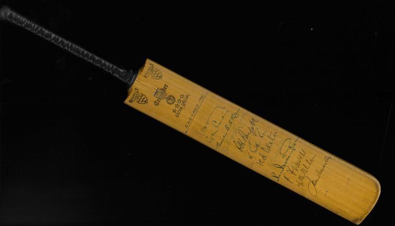 1961 Australian tour to England 'Nicolls' mini-bat, 43cm long, signed by England on front & Australia on reverse, 29 signatures including Peter May, Raman Subba Row, Brian Statham, Richie Benaud, Bill Lawry & Alan Davidson, Fine condition. Also printed photo of 1957-58 Australian team to South Africa with 17 signatures (faults & repaired tears).