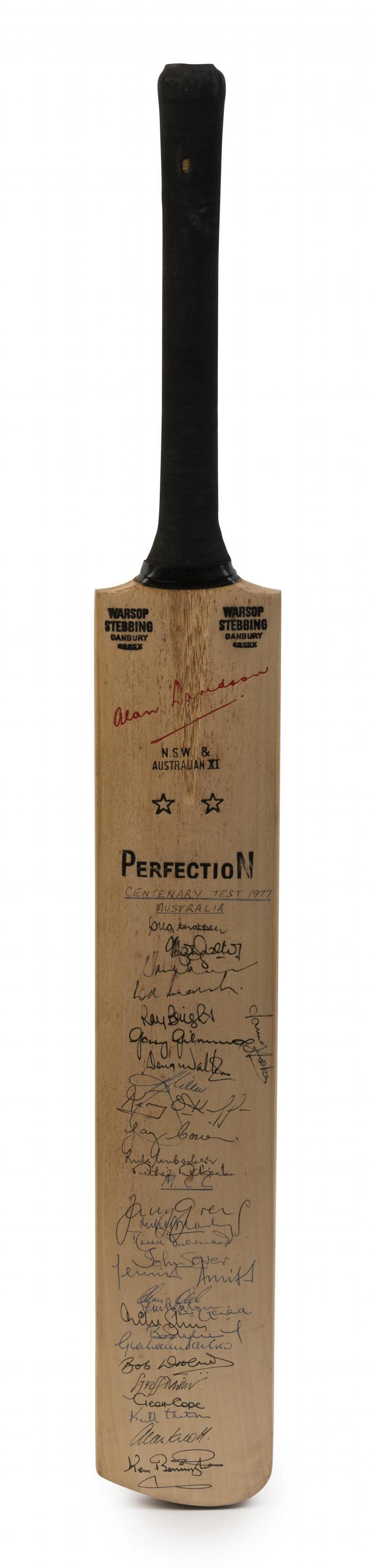 1975-77 'Warsop Stebbing - Alan Davidson' cricket bat, signed on front & reverse by 1975-76 Australia, 1975-76 West Indies; 1977 Centenary Test Australia & England, with 58 signatures including Greg Chappell, Clive Lloyd, Dennis Lillee & Tony Greig, Fair condition (minor tone spots). Ex Alan Davidson collection. (Image1)