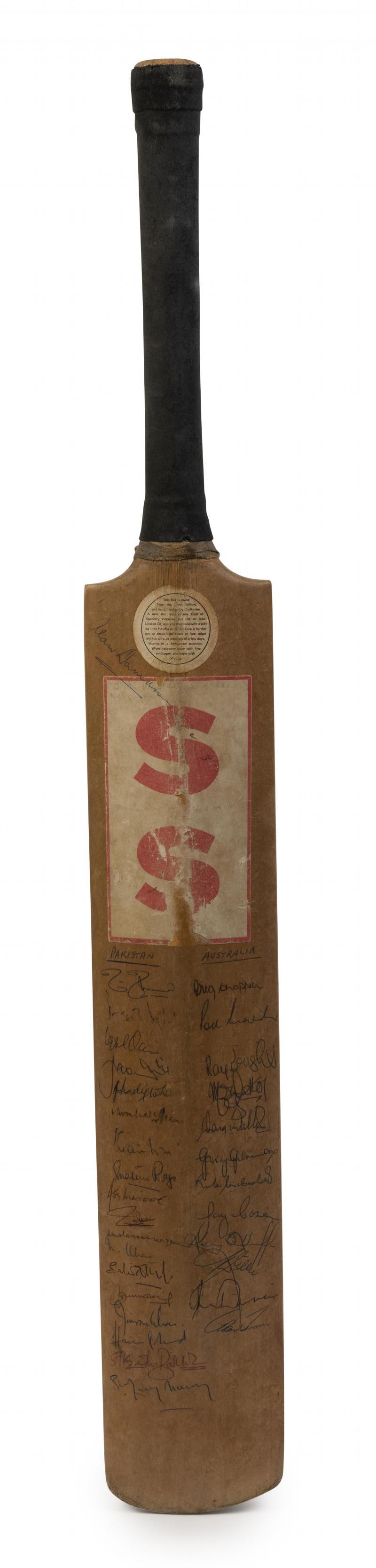 1976-77 'SS' match-used cricket bat, signed on reverse by 1976-77 Australia & Pakistan teams, with 30 signatures including Greg Chappell, Ian Davis, Dennis Lillee, Imran Khan & Asif Iqbal, Fair match-used condition. Ex Alan Davidson collection. (Image1)