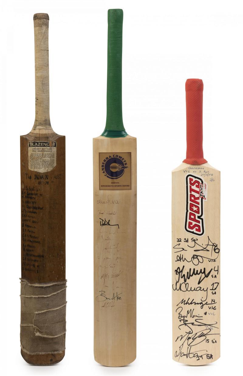1977-2008 Cricket bats x3, comprising (1) 'Slazenger' match-used cricket bat signed by 1977-78 India (18 faded signatures including Bishan Bedi); (2) c.1998 cricket bat signed by Canberra Comets (12 faded signatures including Merv Hughes); (3) 2008 miniature bat signed Victoria vs South Australia (13 signatures).
