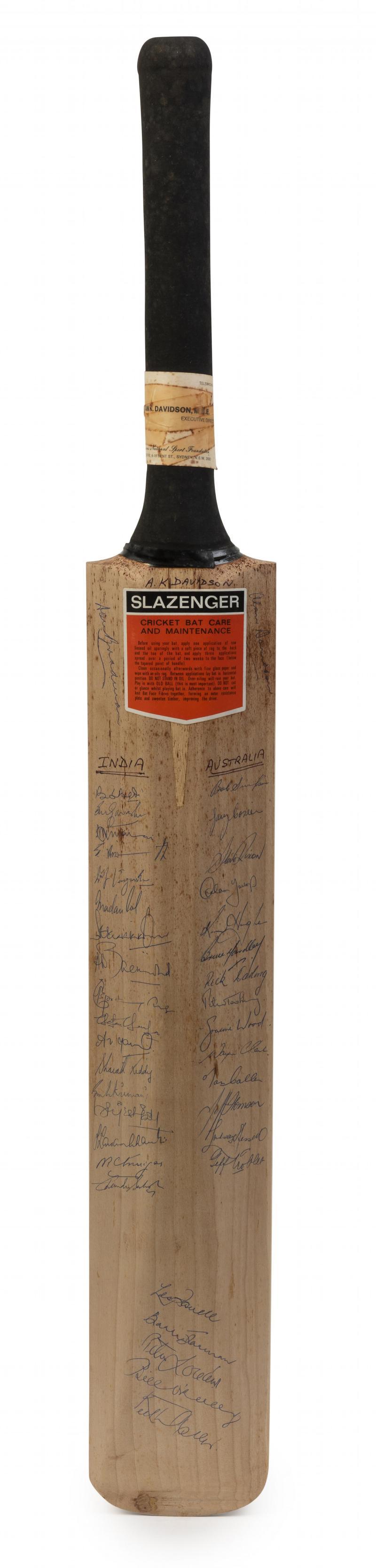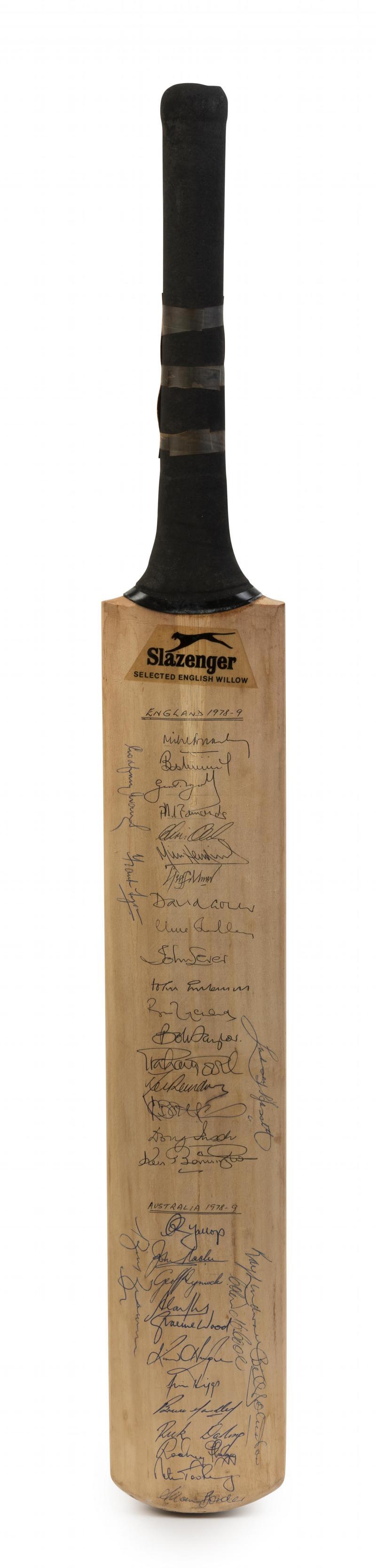 1978-79 'Slazenger' cricket bat, signed on front & reverse by 1978-79 Australia & England, WA, NSW, South Australia, Victoria & Tasmania teams, plus 8 Australian legends (probably due to the WSC "War"), with 103 signatures including Lindsay Hassett, Ray Lindwall, Alan Davidson, Mike Brearley, Graham Yallop, Kim Hughes, Allan Border, Rick Darling & Graeme Wood, Fine condition. Ex Alan Davidson collection. (Image1)
